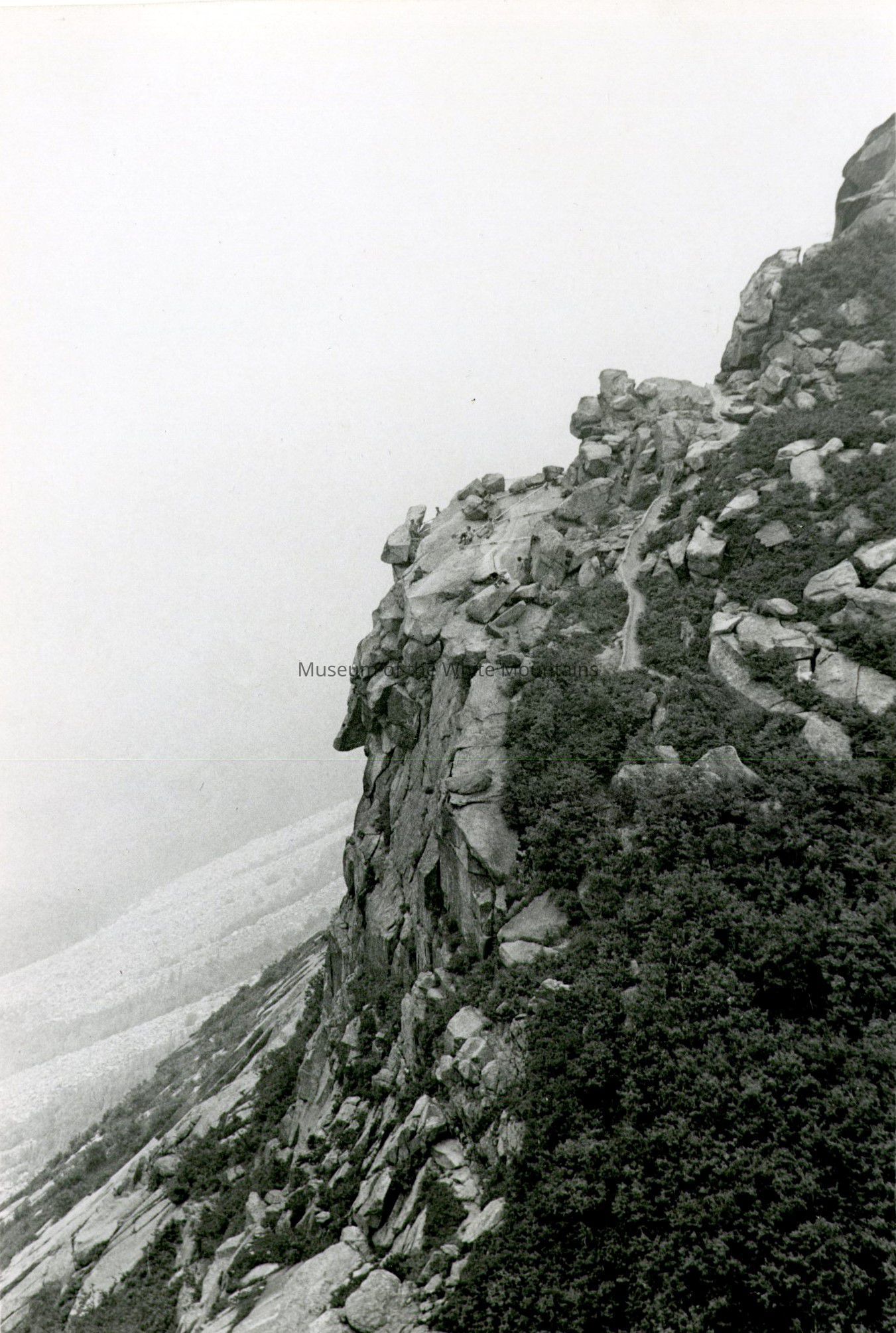 Niels Nielsen and others atop the Old Man of the Mountain and Cannon Cliff. Side view of The Old Man of the Mountain. Possibly taken after the fall of The Old Man of the Mountain.Photograph Details