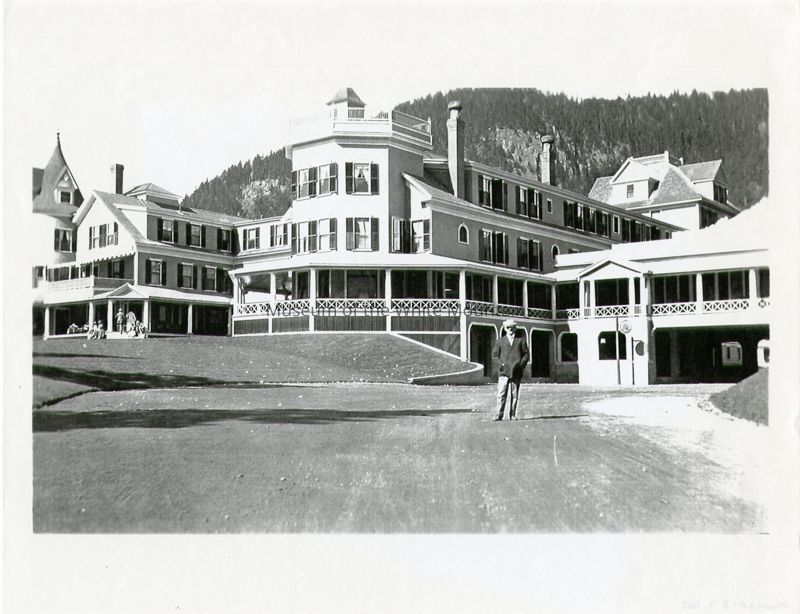 Photograph of a man standing in the road leading to the Balsams Hotel.