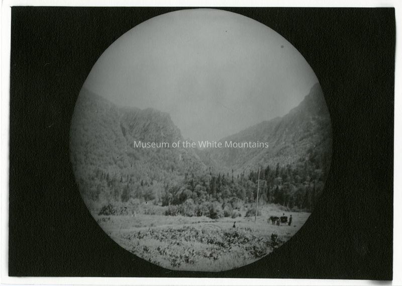 Photograph of people and animals standing in a clearing below Dixville Notch