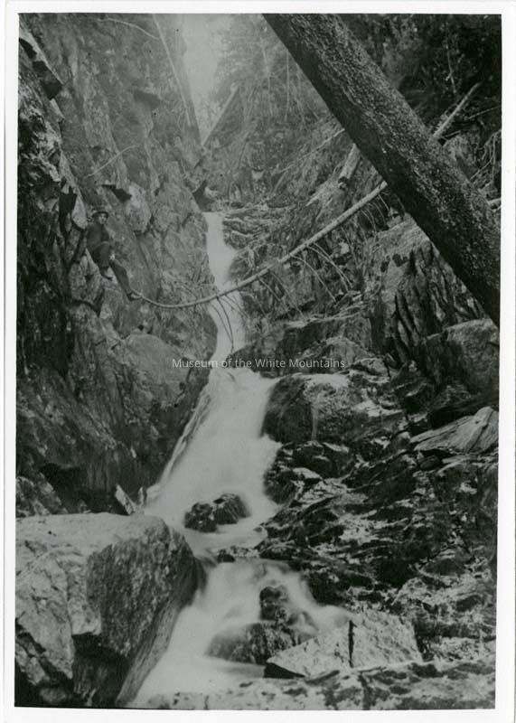 Photograph of a waterfall running through large rocks in the woods of Dixville Notch.