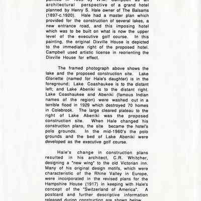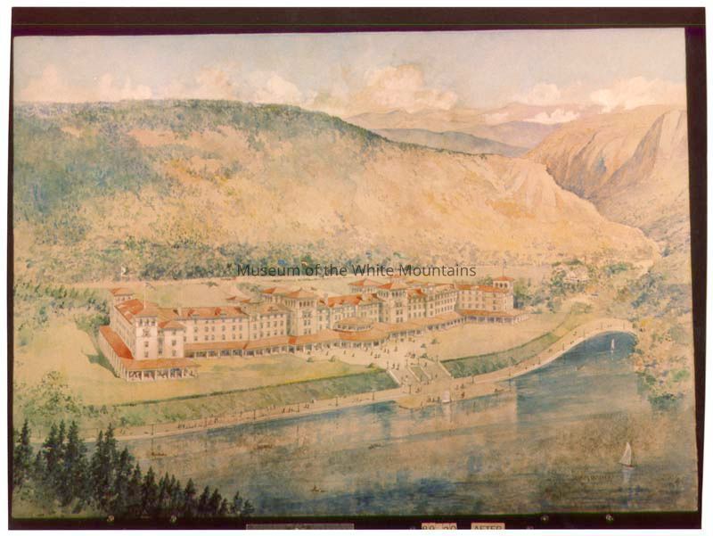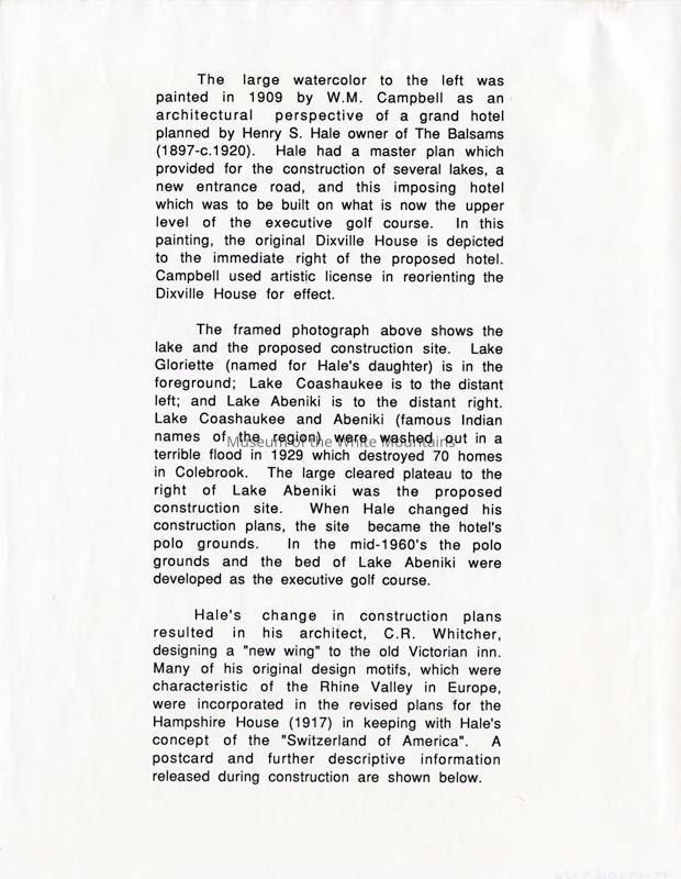 Photocopy of a watercolor painting of the future Balsams Hotel planned by Henry Hale but never built. Created by W.M Campbell circa 1909.