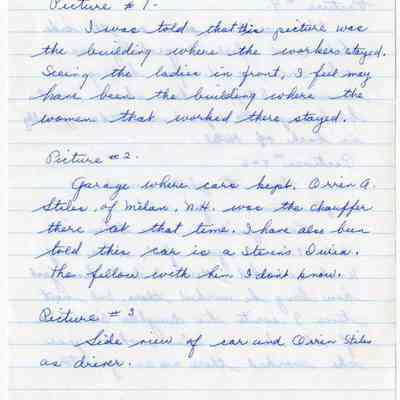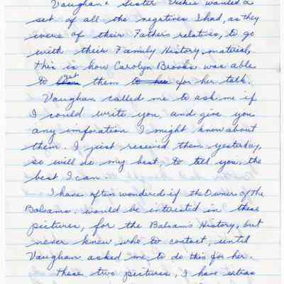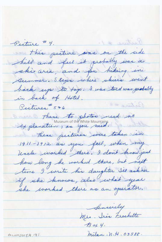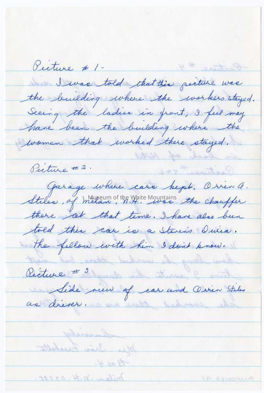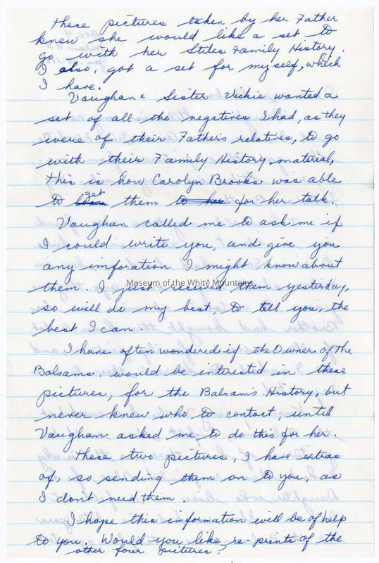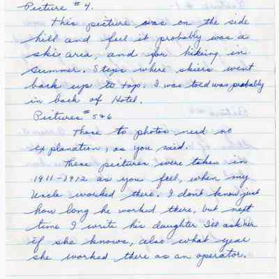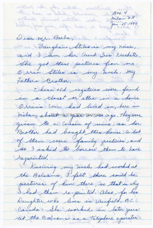 A letter written to Mr. Barba by a niece of a former employee at the Balsams Hotel. The letter describes three photo negatives of the writer's uncle, Orrin Stiles during his time at the Balsams, 1911-1912.