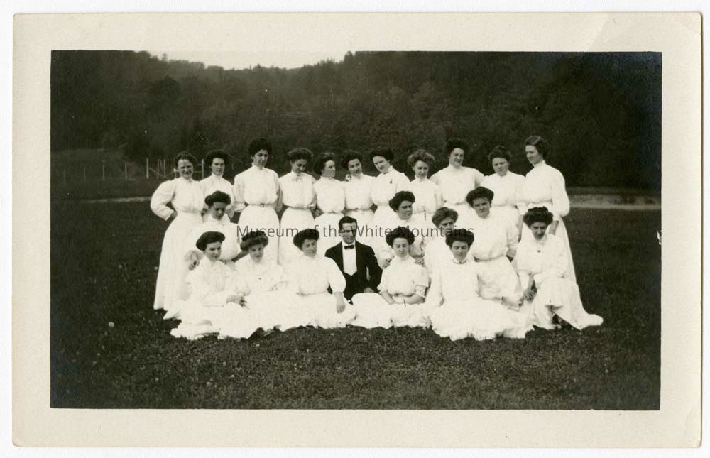 Photograph of a group of women dressed in white posing with a man in a suit at the Balsams Hotel. Likely all are hotel employees.