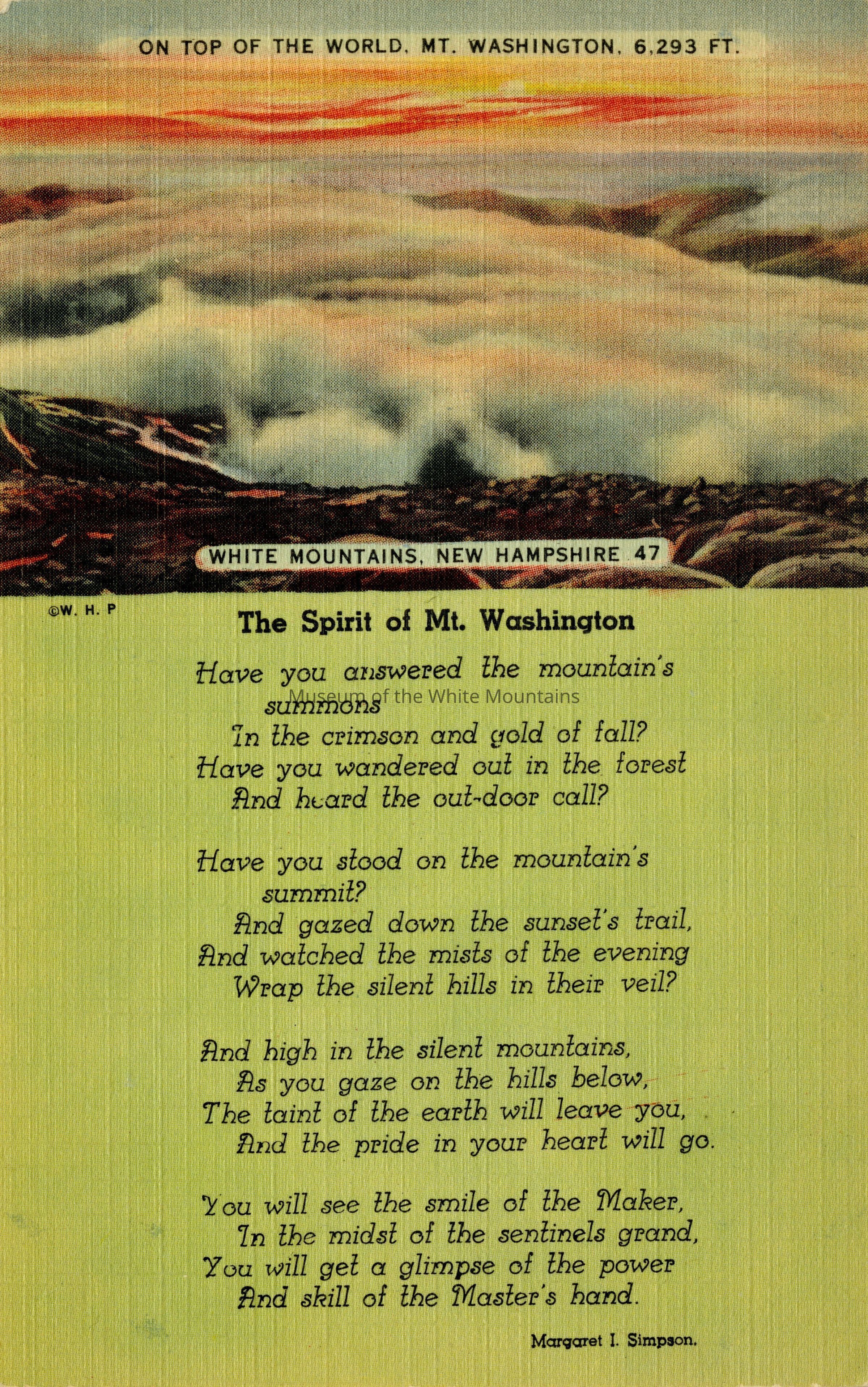 Colorized image featuring either a sunset view of the sky from atop Mount Washington in New Hampshire. Also featured on the postcard is a printed poem from Margaret I. Simpson called "The Spirit of Mt. Washington." It reads: