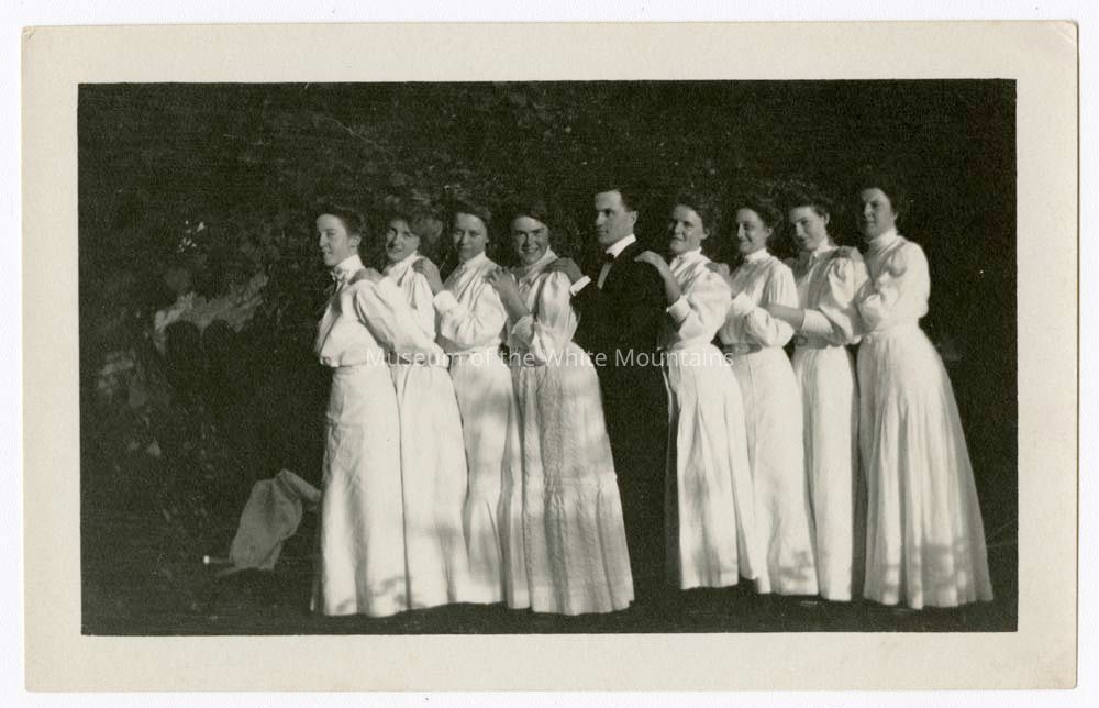 Photograph of a group of women in white dresses posing with a man in a suit at the Balsams Hotel. All are likely hotel employees.