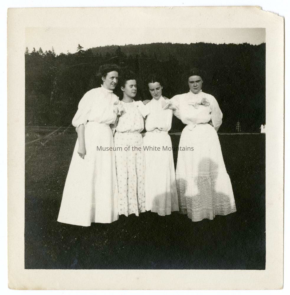 Photograph of four women in white dresses posing together at the Balsams Hotel. All are likely hotel employees.