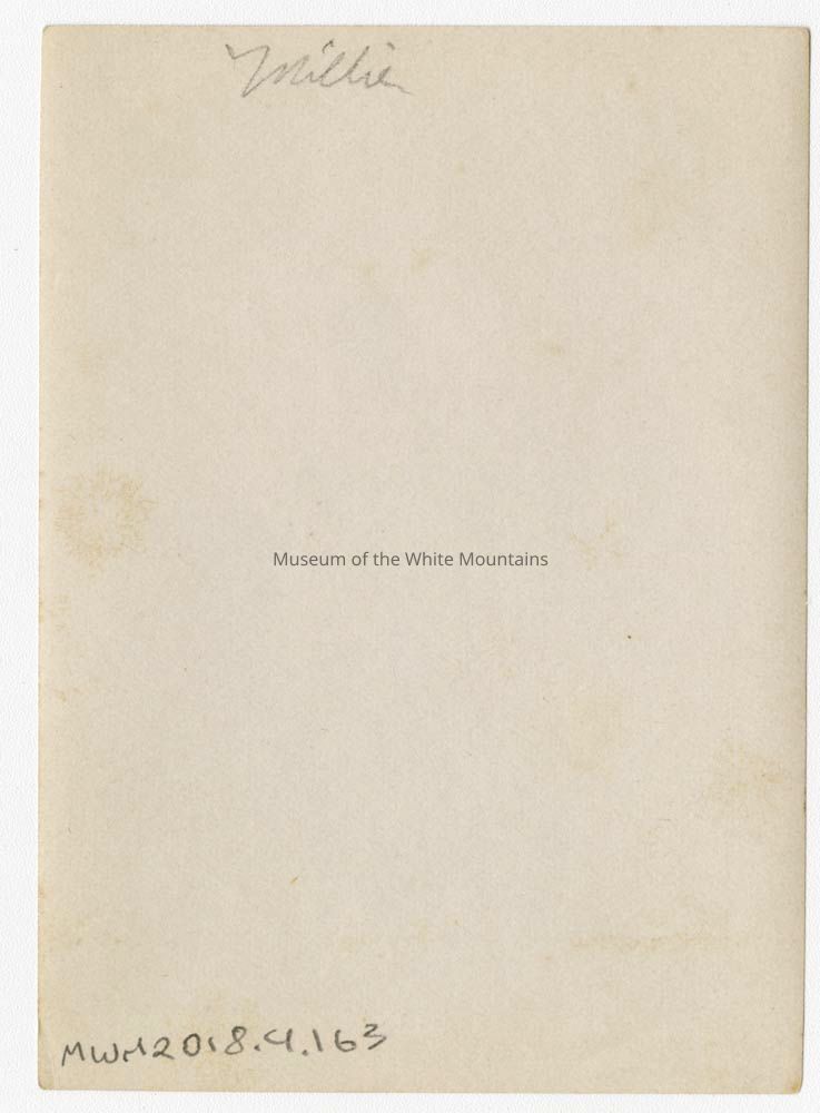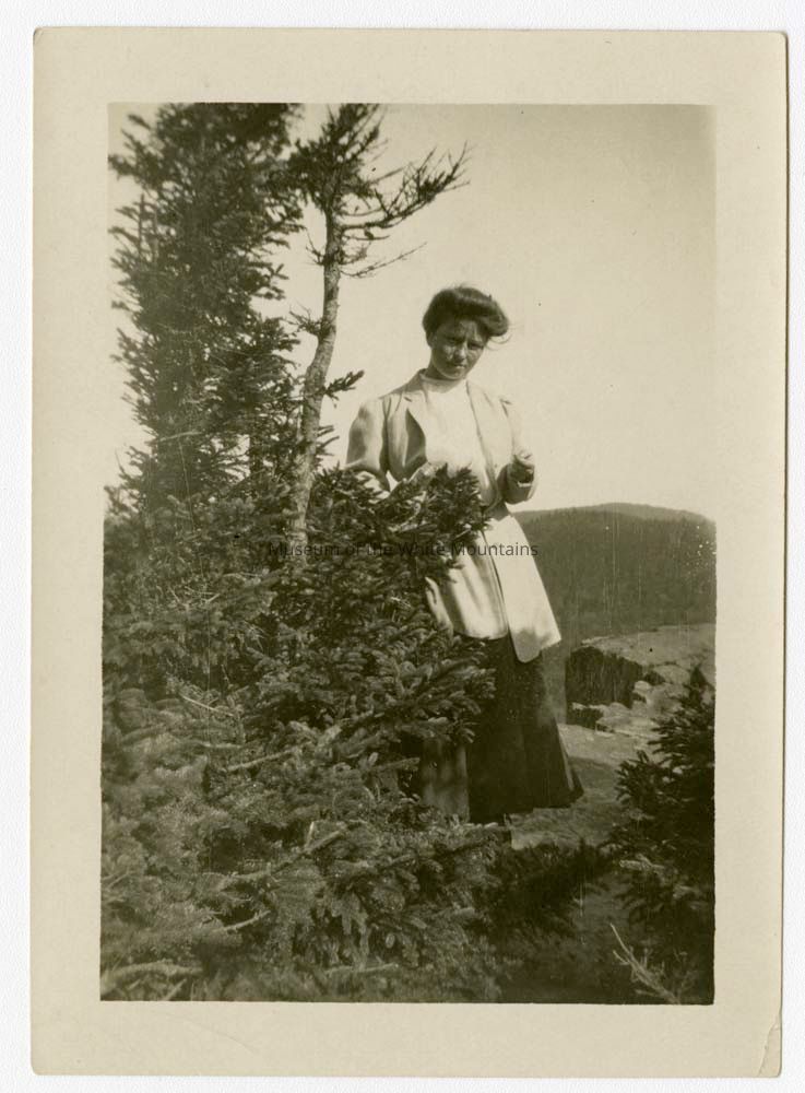 Photograph of a woman named Millie posing near a tree. Behind here are cliffs and rocks.