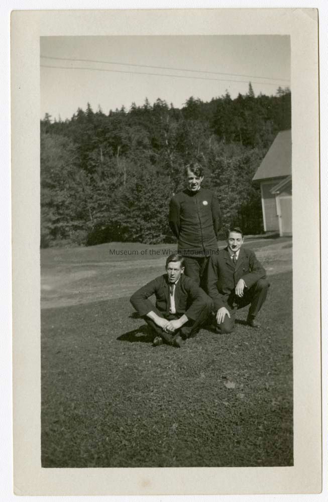 Photograph of three men, likely hotel employees, taken outside of the Balsams Hotel. The man on the far right is Lewis L. Keen.
