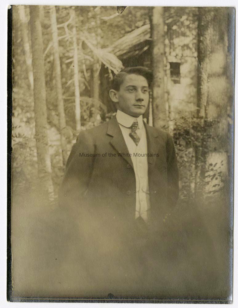Photograph of Lewis L. Keen, likely a hotel employee, wearing a suit and standing in front of trees and a building at the Balsams Hotel.