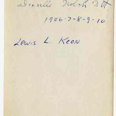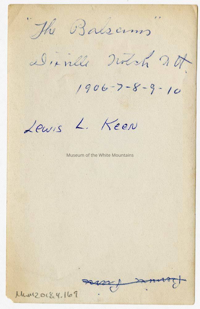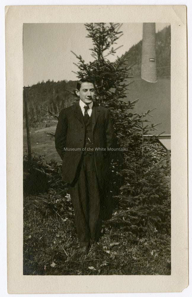 Photograph of Lewis L. Keen, likely a hotel employee, wearing a suit and standing in front of a pine tree taken at the Balsams Hotel circa 1910.