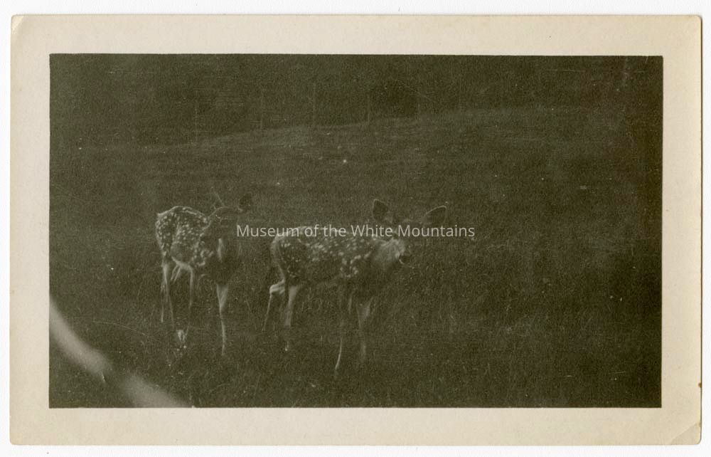 Photograph of two young deer in a field in the Deer Park at the Balsams Hotel.