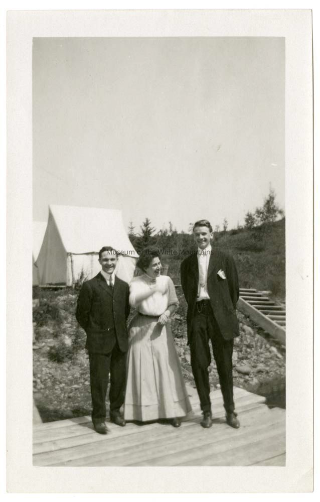Photograph of two men and one woman, likely hotel employees standing on a wooden platform at the Balsams Hotel. In the background several large canvas tents.