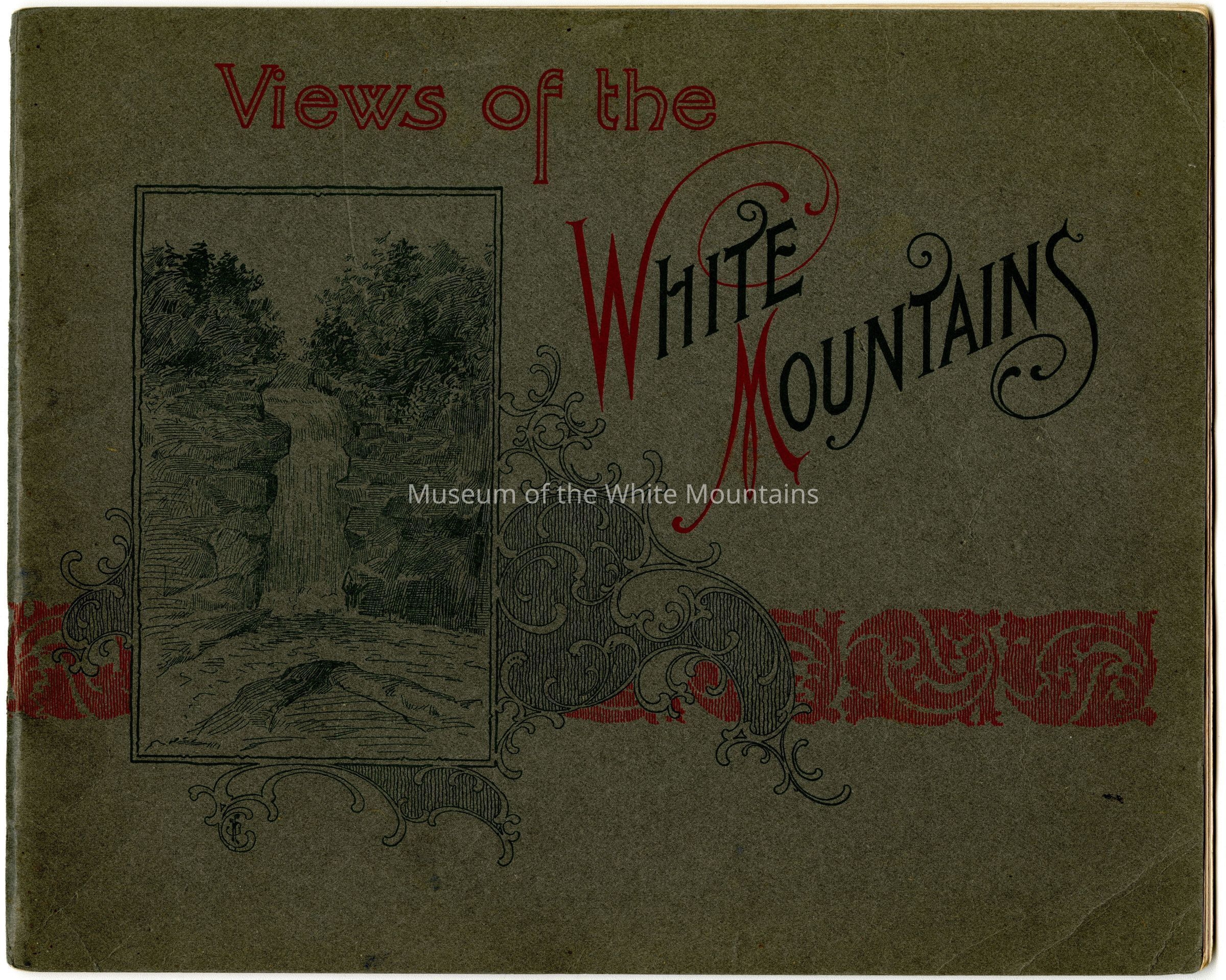 A grey booklet with red detailing containing images of locales in the White Mountains of New Hampshire.