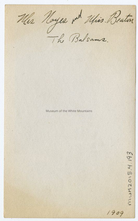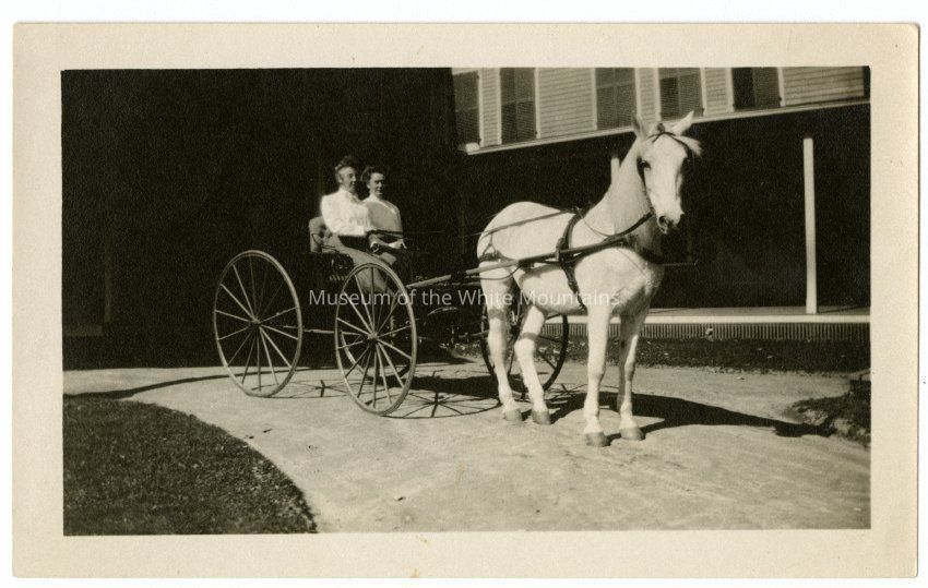 Photograph of two women, Miss Noyes and Miss Beaton, riding in a horse drawn carriage in front of a building at the Balsams Hotel,1909.