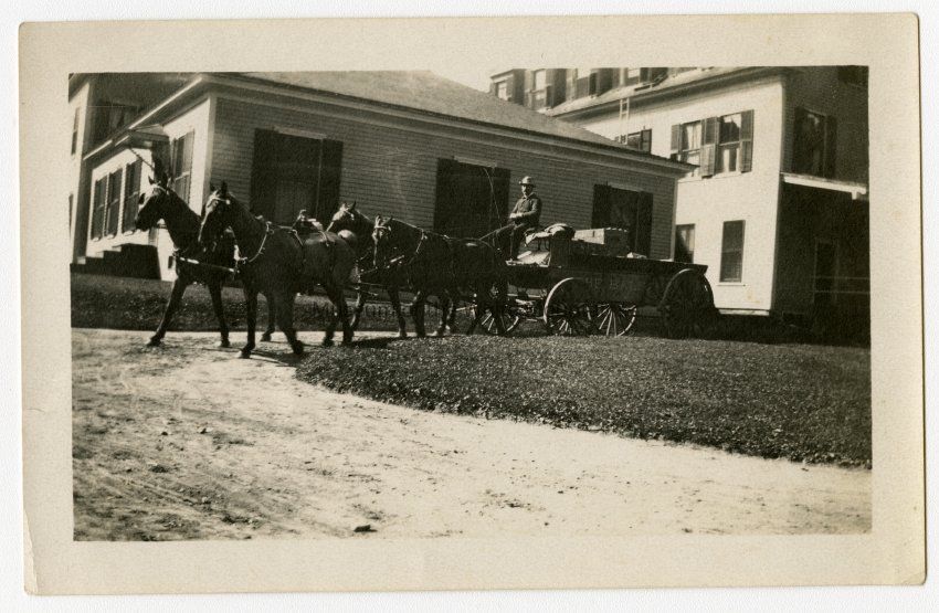 Photograph of a man driving a horse drawn luggage wagon at the Balsams Hotel. The hotel name has been painted on the side of the wagon has been