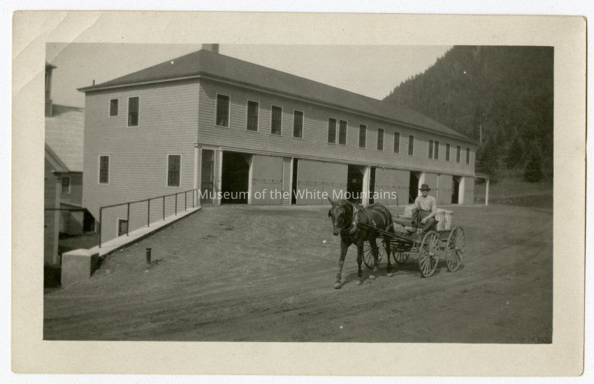 Photograph of a man driving a horse drawn wagon at the Balsams Hotel. In the back of the wagon are what looks like metal trash cans.