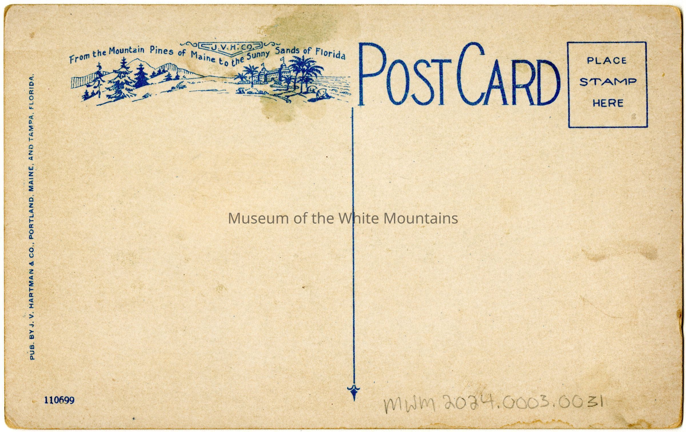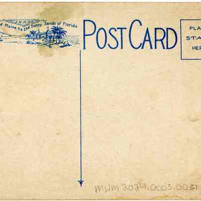 Divided post card back, no writing. Contains mark of J.V.H.CO (J.V. Hartman & CO.), the publisher: From the Mountain Pines of Maine to the Sunny Sands of Florida.Subject