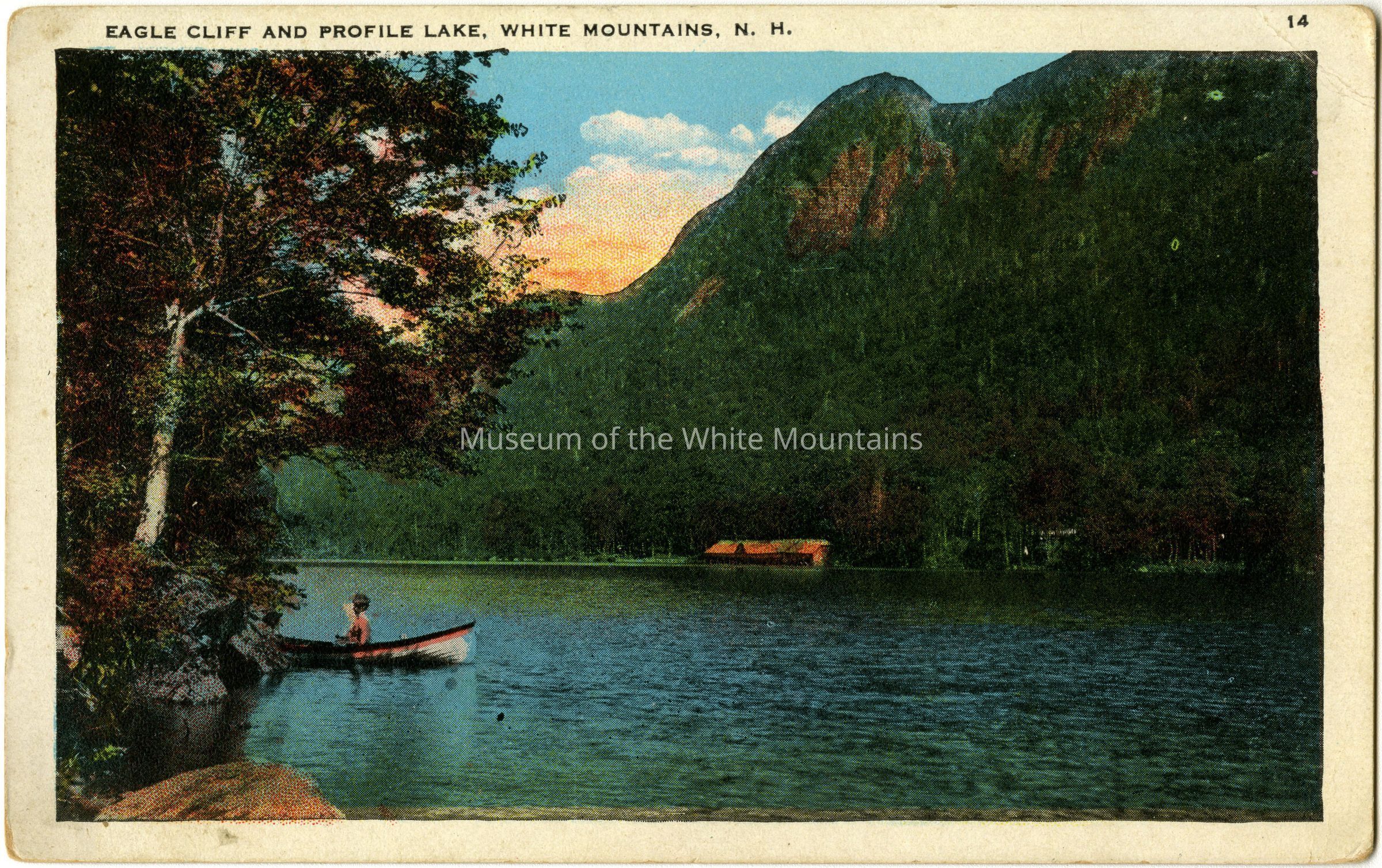 A postcard containing a landscape image of Eagle Cliff and Profile Lake, White Mountains, NH. The image is in color.