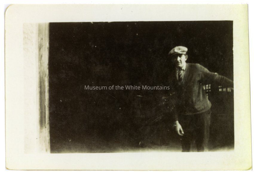 Photograph of a man wearing a jacket and cap standing in front of a garage at the Balsams Hotel.