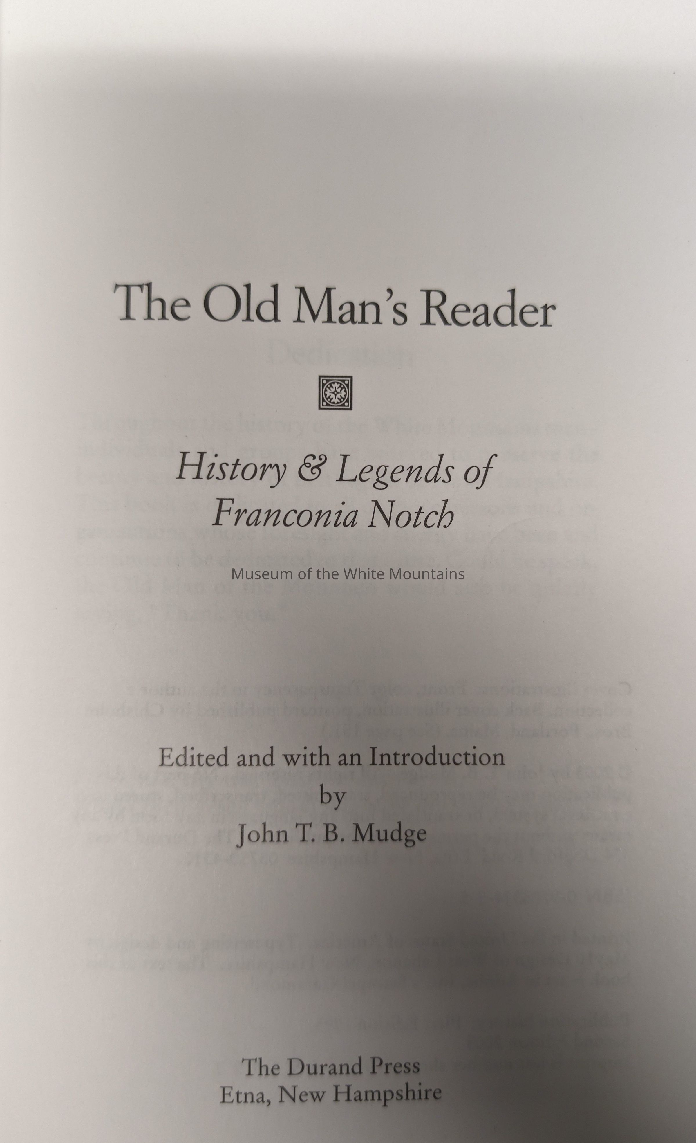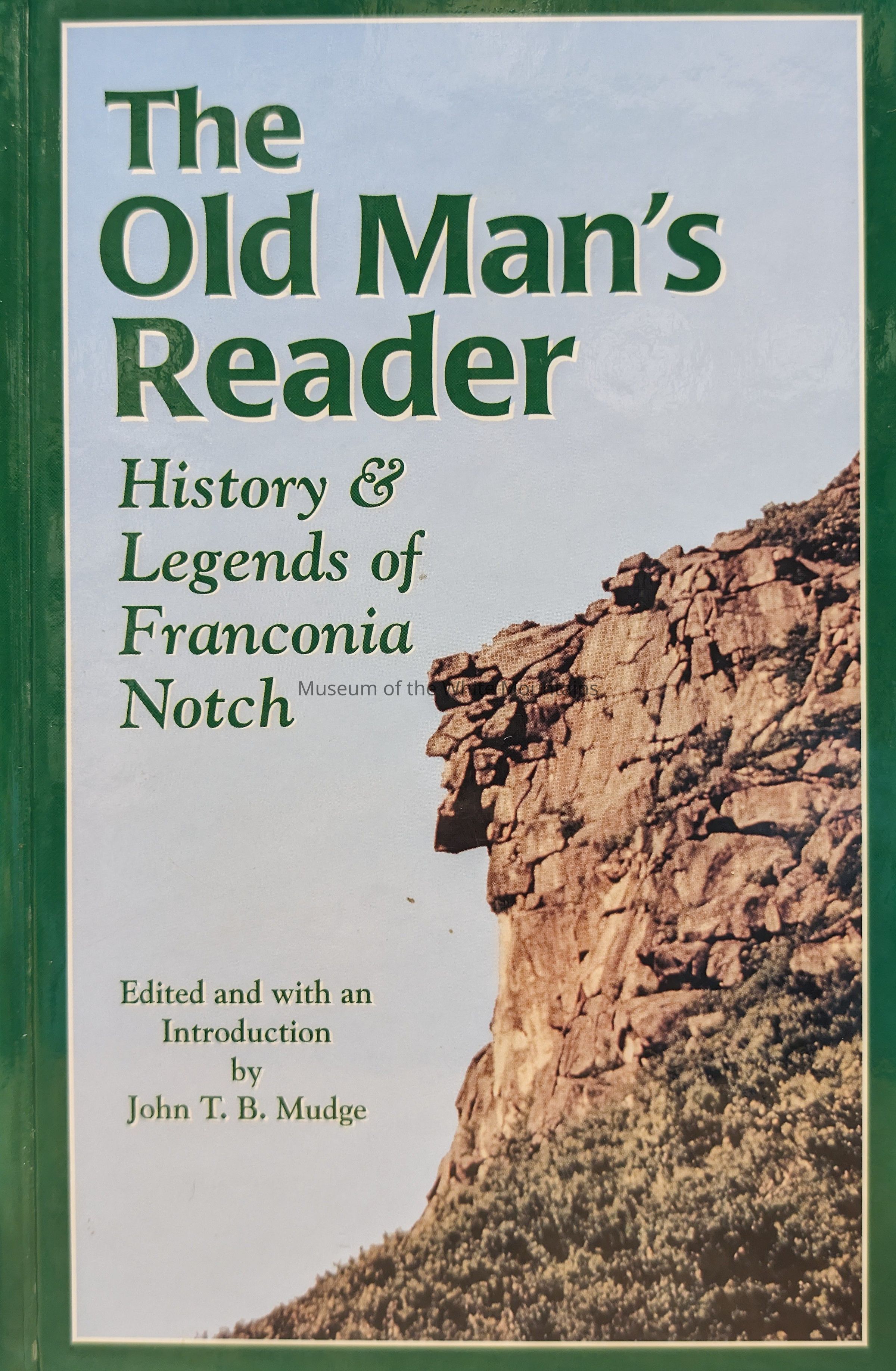 Book containing the history of the Old Man of the Mountain. Written and compiled by John Mudge, The Old Man's Reader details various legends surrounding the Old Man, in addition to his history and place within the context of New Hampshire's identity. Other compiled sources including guidebooks, plays, essays, newspapers, and poetry are used to describe the ways in which the Old Man made an impact on the state of New Hampshire.Collection
