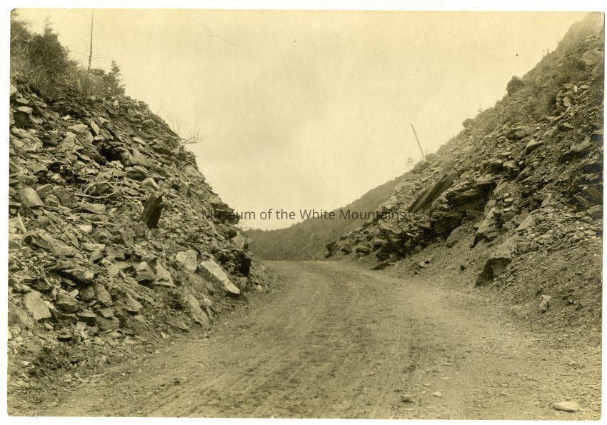Photograph of a dirt road running through rocky ledges of Dixville Notch.