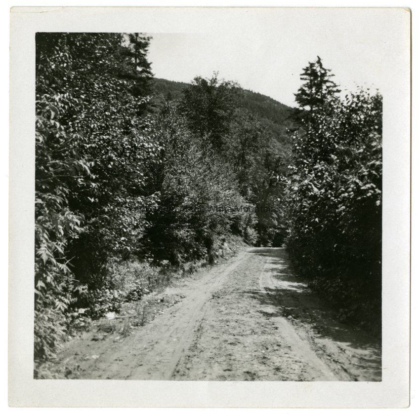 Photograph of a dirt road running through the woods of Dixville Notch.