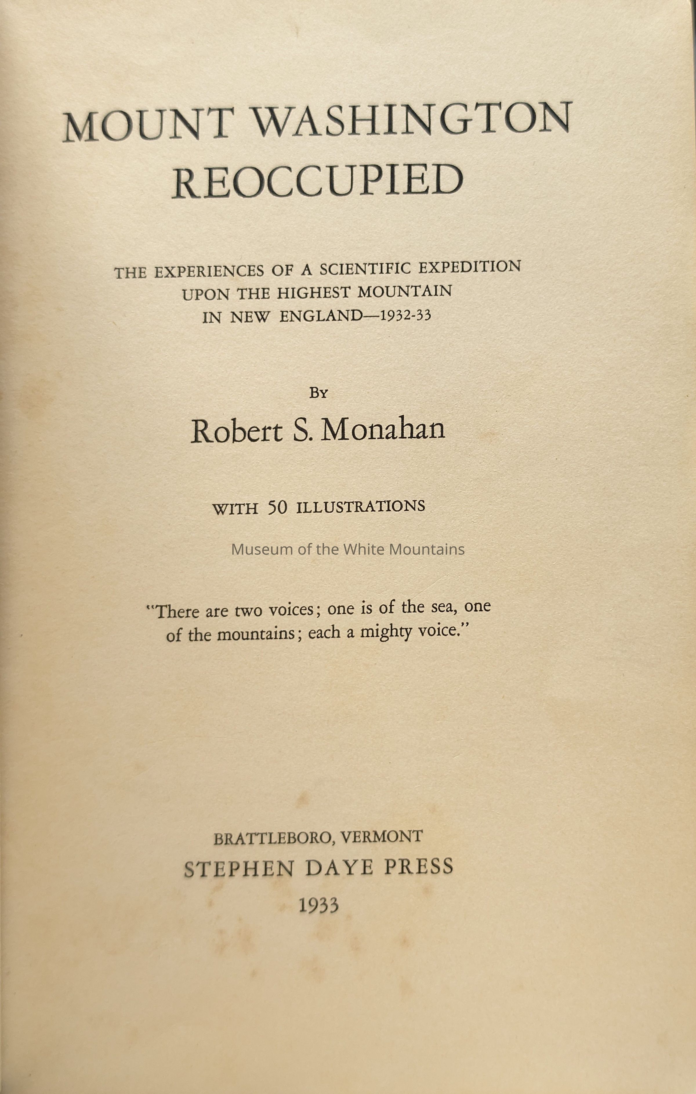 This is a hardcover book. It details scientific expeditions on Mount Washington between 1932 and 1933 and contains 50 illustrations and photographs. The experiences are outlined as diary entries over the course of the year.Collection