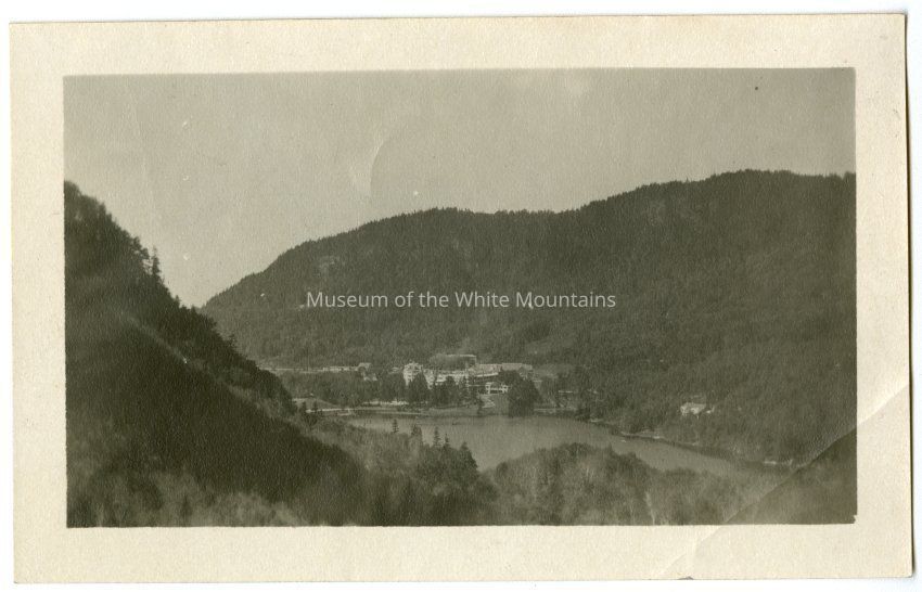Photograph of the Balsams Hotel and Lake Gloriette taken from the Dixville Mountains.