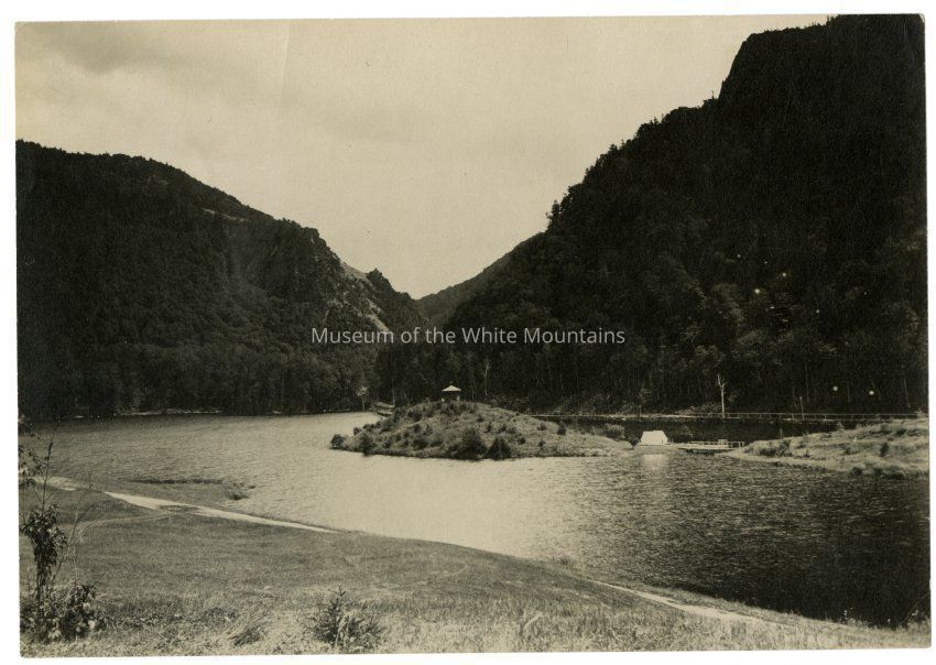 Photograph of two islands in the middle of Lake Gloriette with a bridge connecting them. The island on the left has a gazebo on built on it.