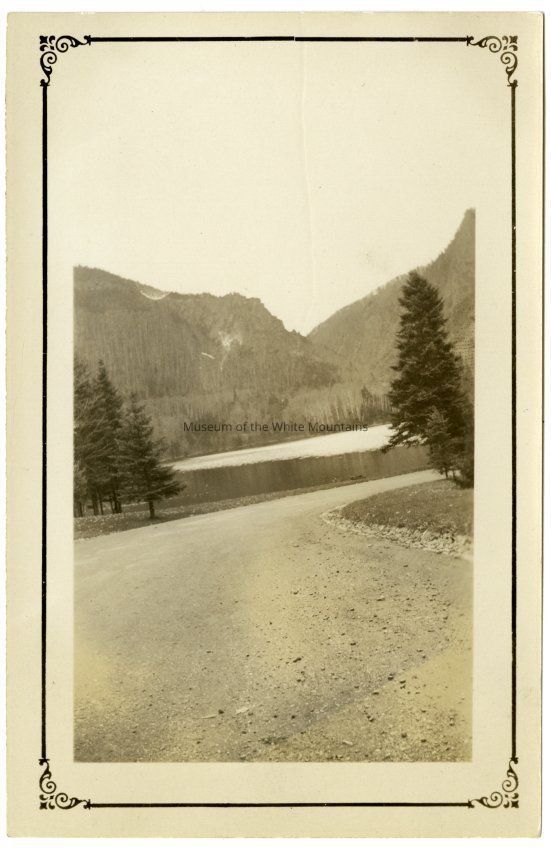 Photograph of a dirt road running alongside Lake Gloriette with a decorated frame around the image.