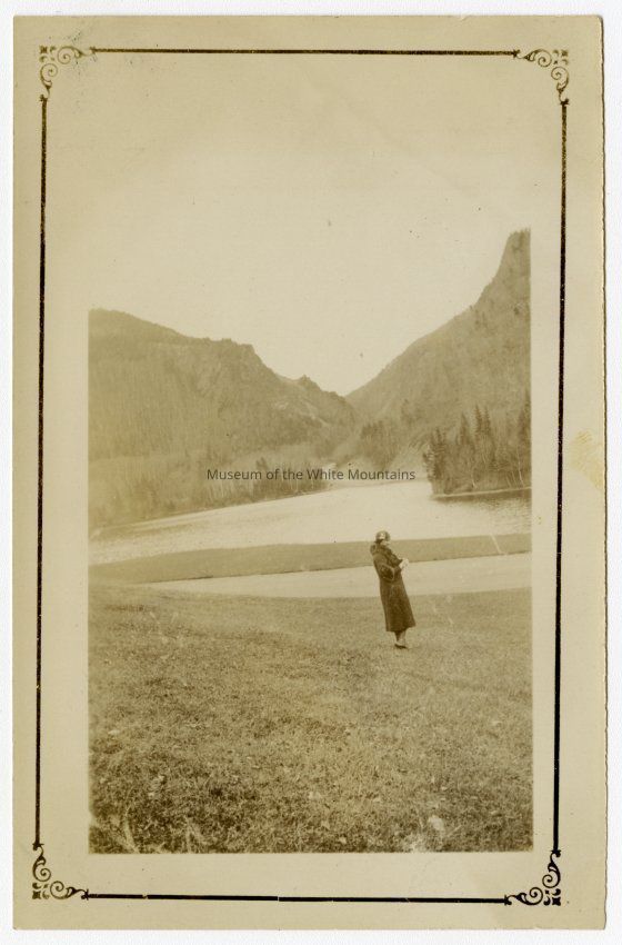 Photograph of a woman standing on the grass by Lake Gloriette at the Balsams Hotel with a decorated frame around the image.