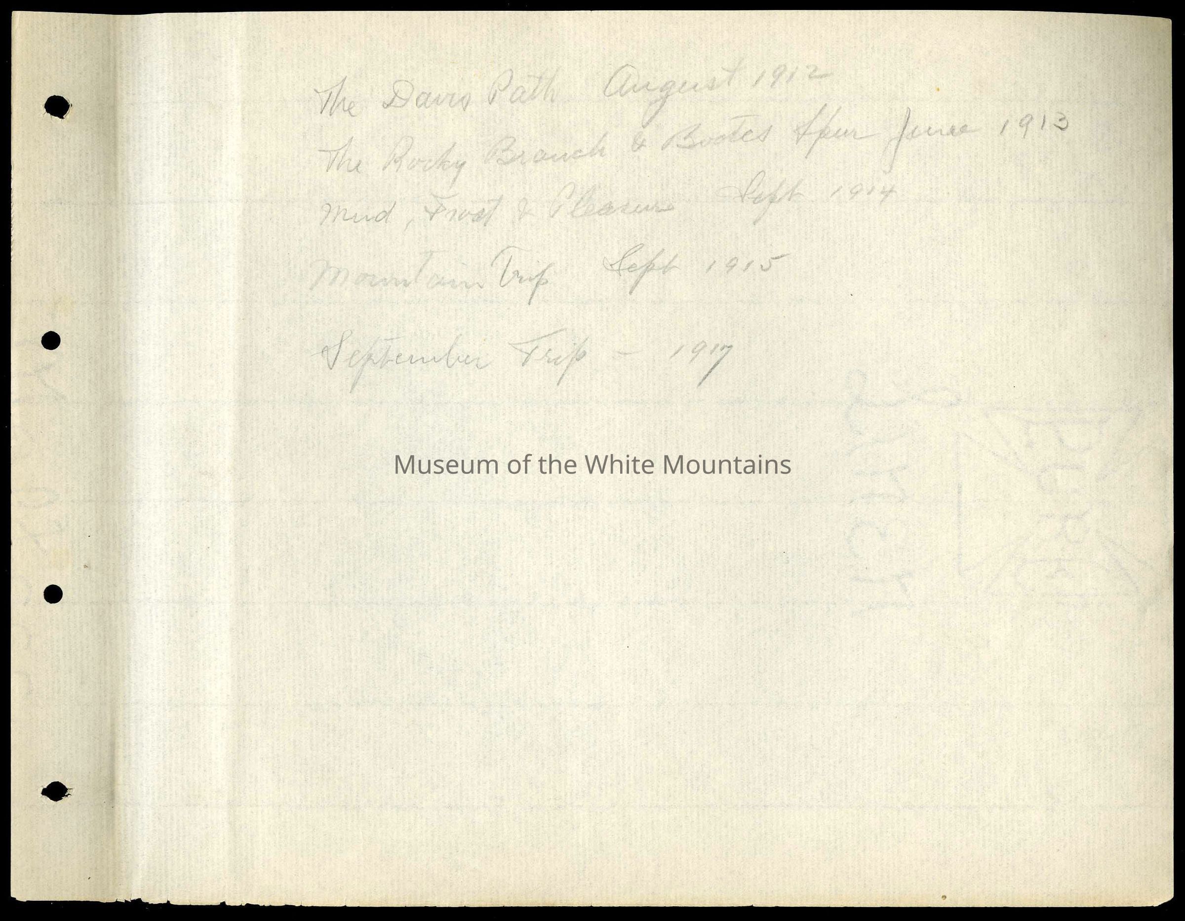 Albany Intervale (New Hampshire : valley), Ammonoosuc Ravine Trail (New Hampshire : trail), Bartlett (Carroll county, New Hampshire : inhabited place), Base Station (Coos county, New Hampshire : inhabited place), Bear Mountain Notch (Carroll county, New Hampshire : trail), Bear Mountain Notch (New Hampshire : trail), Boott Spur (Coos county, New Hampshire : peak), Bretton Woods (Coos county, New Hampshire : inhabited place), Castellated Ridge (Coos county, New Hampshire : ridge), Cathedral Woods (Carroll county, New Hampshire : forest), Champney Falls (Carroll county, New Hampshire : waterfall), Chocorua, Mount (Carroll county, New Hampshire : peak), Crawford Notch (New Hampshire : valley), Crawford Path (New Hampshire : trail), Crawford, Mount (Coos county, New Hampshire : peak), Davis Path (Carroll county, New Hampshire : trail), Davis Trail (Carroll county, New Hampshire : trail), Davis, Mount (Coos county, New Hampshire : peak), Eagle Cliff (Grafton county, New Hampshire : peak), Flume, The (Grafton county, New Hampshire : valley), Glen (Carroll county, New Hampshire : inhabited place), Gulfside Trail (Coos county, New Hampshire : trail), Intervale (Carroll county, New Hampshire : inhabited place), Intervale House (Carroll county, New Hampshire : inhabited place), Isolation, Mount (Coos county, New Hampshire : peak), Israel Ridge Path (Coos county, New Hampshire : trail), Jackson (Carroll county, New Hampshire : inhabited place), Jackson Trail (Carroll county, New Hampshire : trail), Jefferson, Mount (Coos county, New Hampshire : peak), Kearsarge Hall (Carroll county, New Hampshire : inhabited place), Lakes of the Clouds (Coos county, New Hampshire : lake), Lakes of the Clouds Hut (Coos county, New Hampshire : inhabited place), Lincoln (Grafton county, New Hampshire : inhabited place), Lynn (Sullivan county, New Hampshire : inhabited place), Meserve Brook (Carroll county, New Hampshire : stream), Mountain View House (Coos county, New Hampshire : inhabited place), North Conway (Carroll county, New Hampshire : inhabited place), North Woodstock (Grafton county, New Hampshire : inhabited place), Point Surprise (Carroll county, New Hampshire : peak), Portsmouth (Rockingham county, New Hampshire : inhabited place), Randolph (Coos county, New Hampshire : inhabited place), Rocky Branch (New Hampshire : stream), Rocky Branch Ridge (Coos county, New Hampshire : ridge), Saco River (United States : river), Shoal Pond (Grafton county, New Hampshire : lake), Six Husbands (New Hampshire : trail), Sleeper Brook (Sullivan county, New Hampshire : stream), Summit House (Coos county, New Hampshire : inhabited place), Surprise, Mount (Carroll county, New Hampshire : peak), Tuckerman Ravine (Coos county, New Hampshire : valley), Washington, Mount (Coos county, New Hampshire : mountain), Willey House (Carroll county, New Hampshire : inhabited place), Trails, Carriages