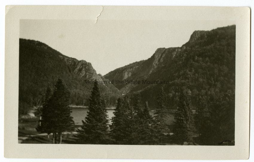 Photograph of the Dixville Mountains with Lake Gloriette visible through the trees.
