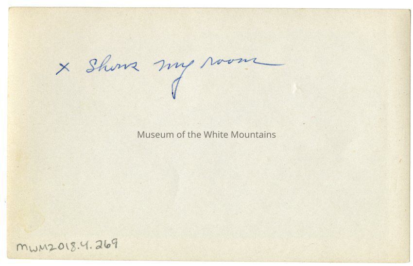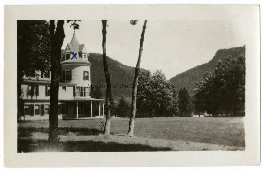 Photograph of the Balsams Hotel with Dixville Notch in the background. There is an 'X' over the turret, which marks the photographers room at the time.