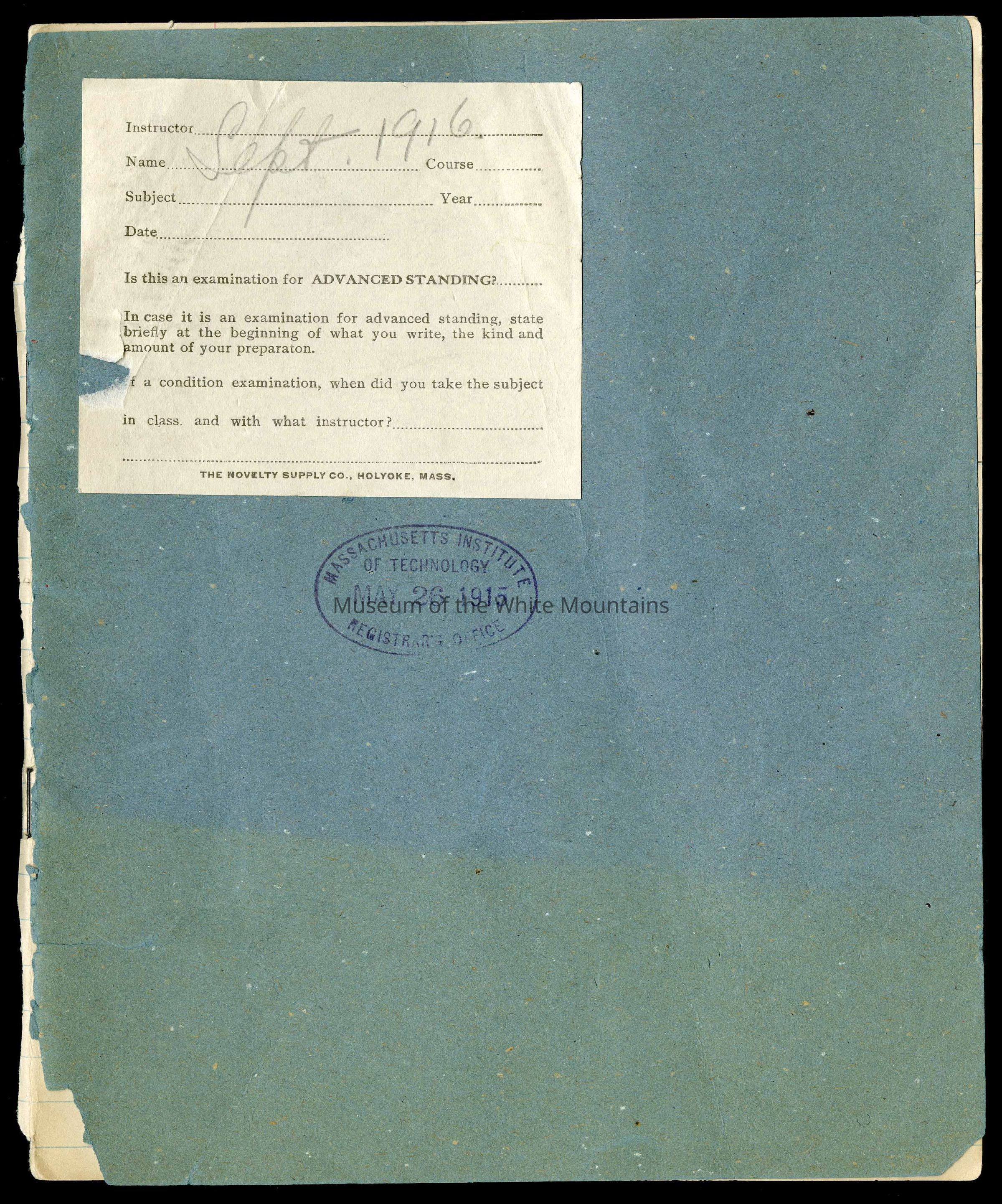 Item is a blue examination booklet detailing Walter H. and Ida Rachel James trip taken in 1916. The writing is mostly illegible.