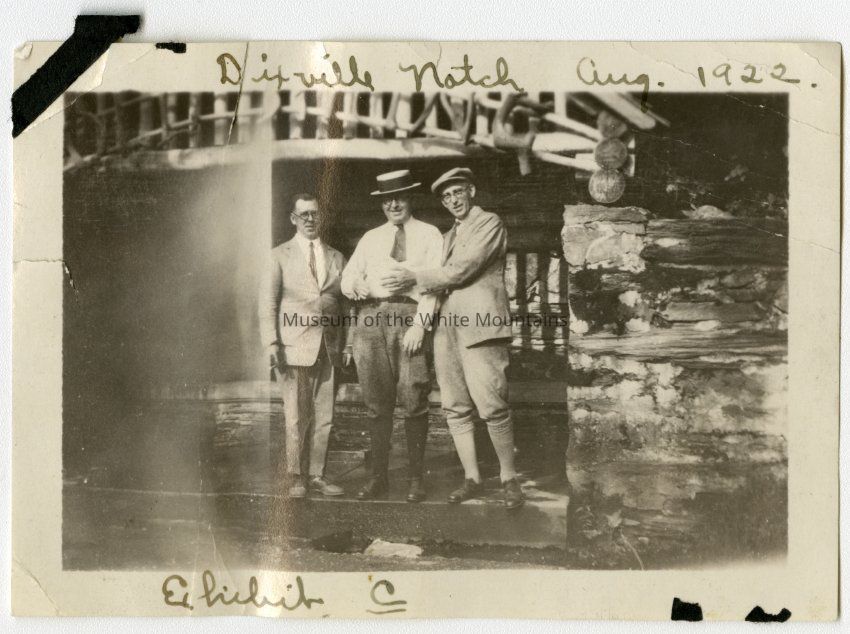 Photograph of three men standing in front of the cold spring in Dixville Notch. This image was taken in August of 1922.