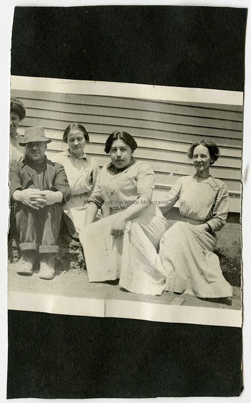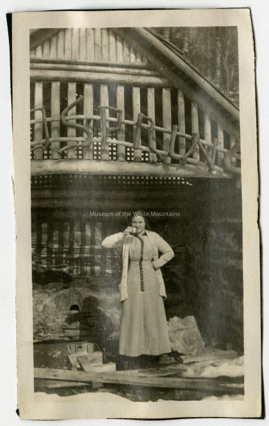 Photograph of a woman holding a cup standing in front of an arch at the Balsams Spring House. Cut from the page of a photo album. On the verso is a photograph of four women and one man sitting in front of a building at the Balsams Hotel.