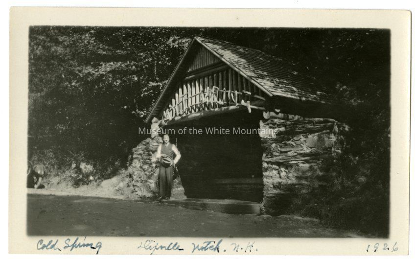 Photograph of a man standing by the cold spring in Dixville Notch taken in 1926.
