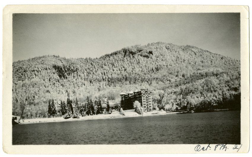 Photograph of the Balsams Hotel from across Lake Gloriette. This photo was taken on October 8th of 1921.