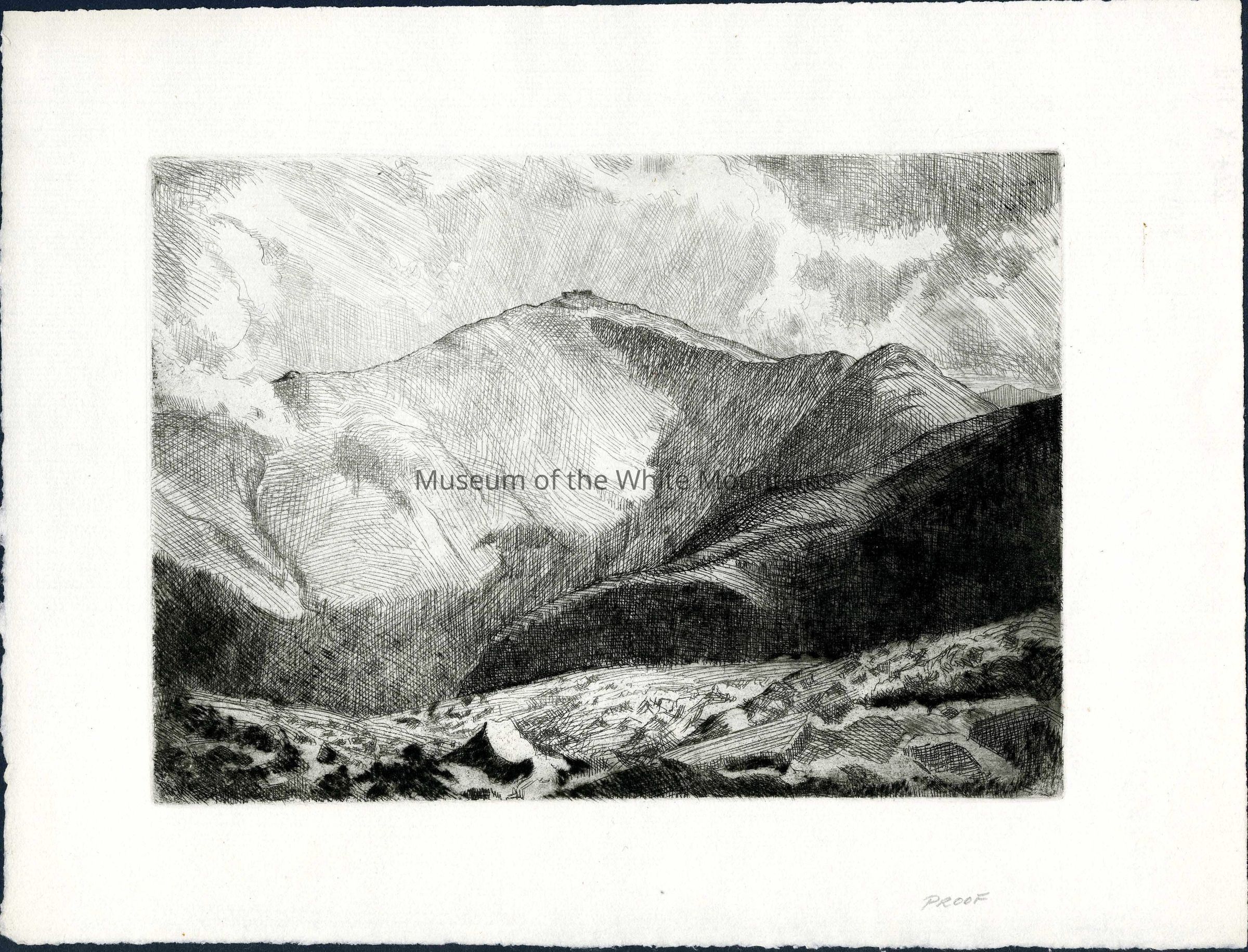 "Mt. Washington." Etching by Lerory R. Woodard, one of his first copies, probably done on copperplate in 1930 or so. Featuring the summit of Mt. Washington. "Proof" is written on the lower right hand corner in pencil.