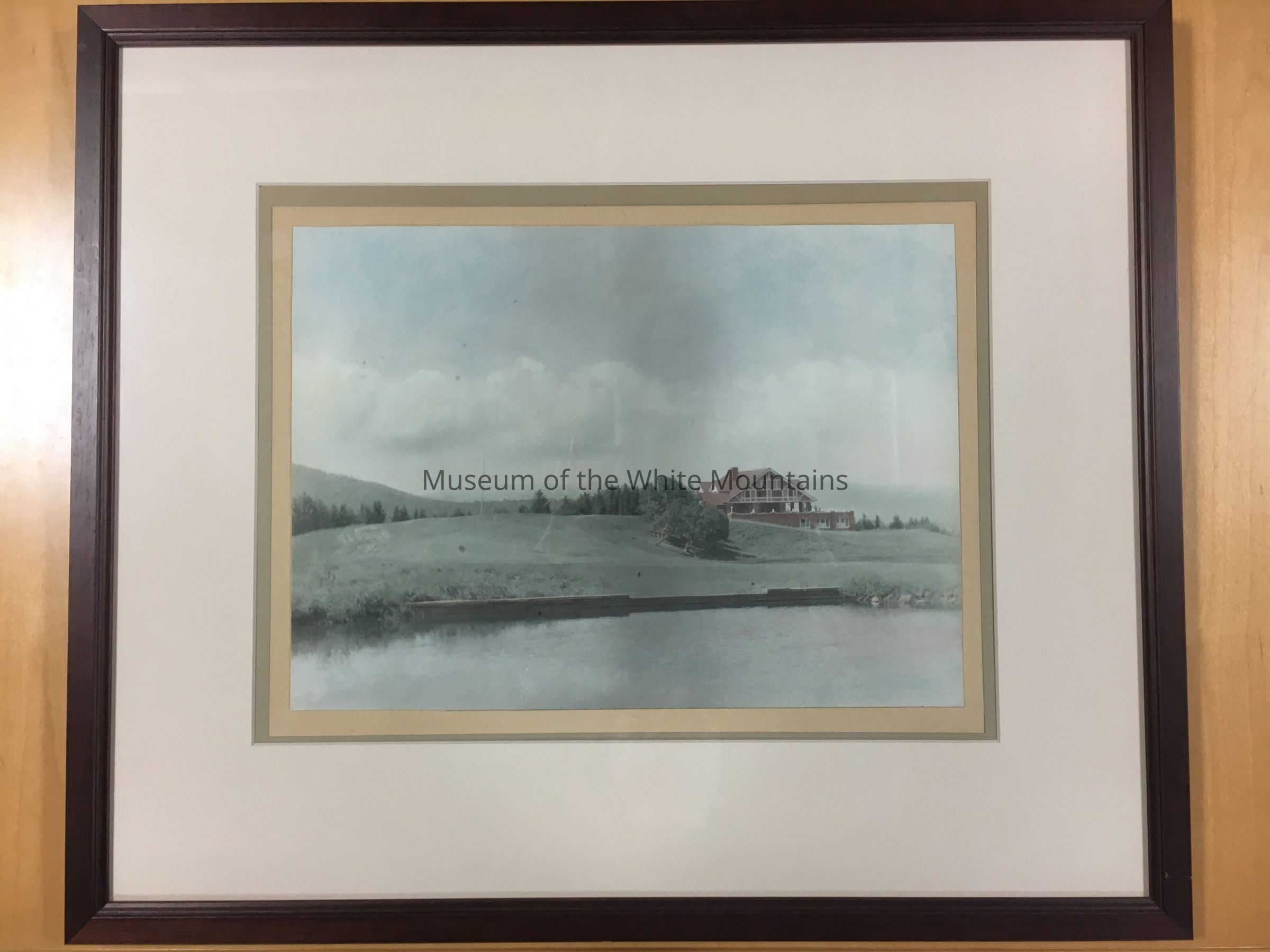 This image depicts what looks to be a house on a hill with a river or lake in the foreground. There are mountains in the background. The image looks to be painted and is framed by a dark wooden border.
