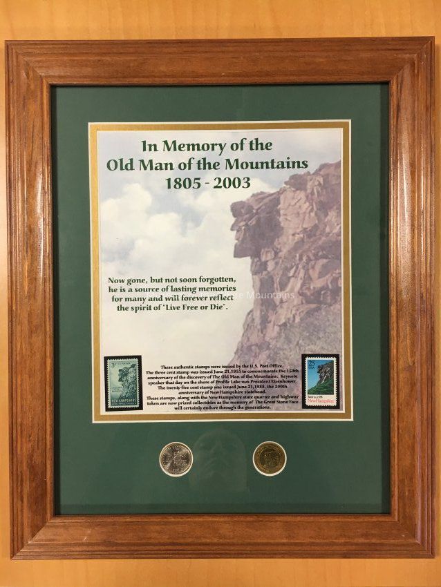 This image is a plaque commemorating the Old Man of the Mountains that fell in 2003. It contains a blurb about the stamps and quarters made with the Great Stone Face on them and when they were installed by the government. The image of the Old Man of the Mountain sits in the background. The plaque is framed by a wooden frame.