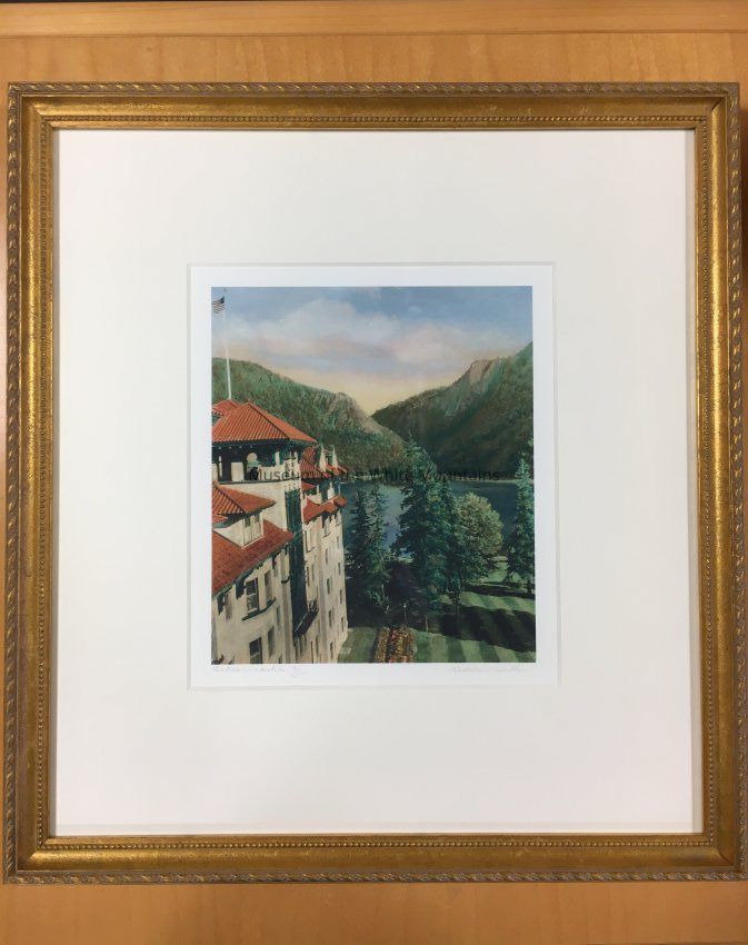 This image of the Balsams shows one of the towers overlooking Lake Gloriette and the mountains of the Dixville Notch. The lawn and trees that sit out front can also be seen. The image looks to have been drawn and then painted. This picture is framed by a gold colored metal frame.