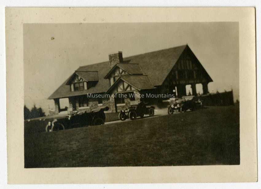 Photograph of three vehicles in the driveway of the golf clubhouse at the Balsams Hotel.