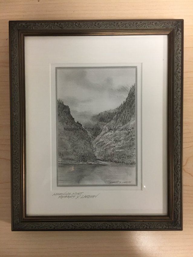 This picture looks to be handdrawn with pencil. It is an image of Lake Gloriette and the Dixville Notch mountains in the background. It is framed in a metal frame with tiny details. There is a name written on the bottom: "Robert Y. Larsen", who may be the person who drew it. The picture is also named "Morning Mist".