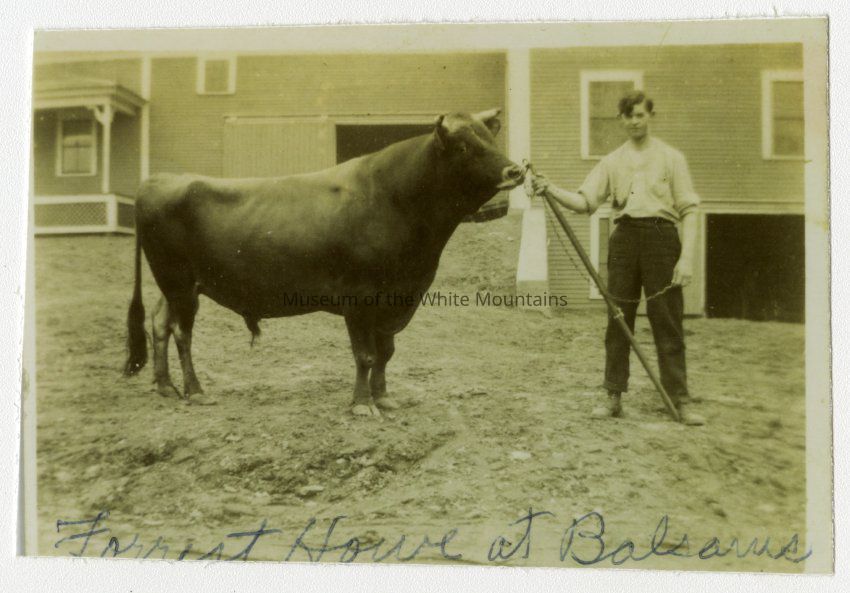 Photograph of a man named Forrest Howe standing with a bull at one of the farms that supplied The Balsams Hotel.