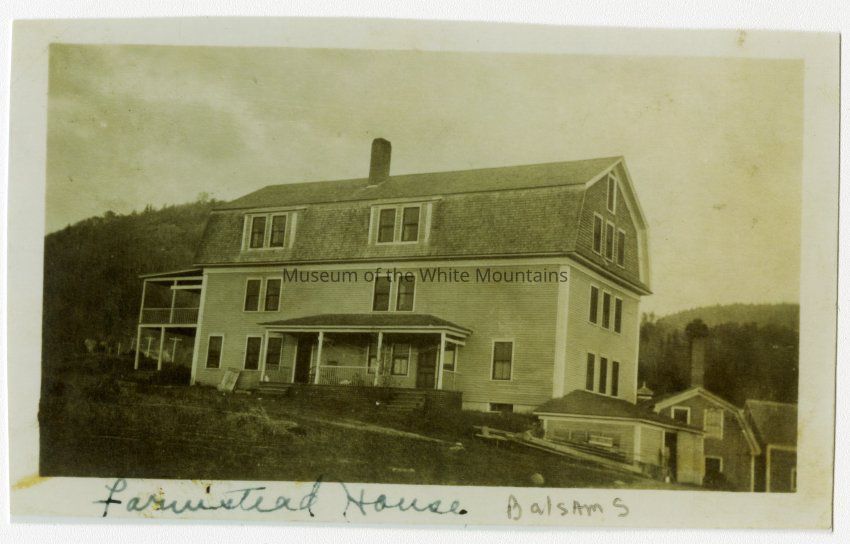 Photograph of the Farmstead House at the Balsams Hotel. It is a two and a half story building with gambrel roof and two story porch to the left.