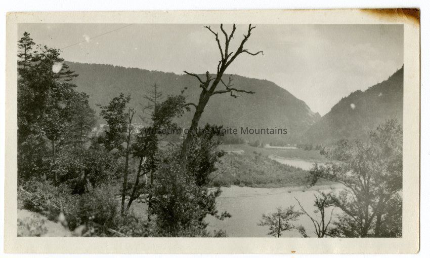 View of a river winding through the Dixville Mountains from behind the trees.