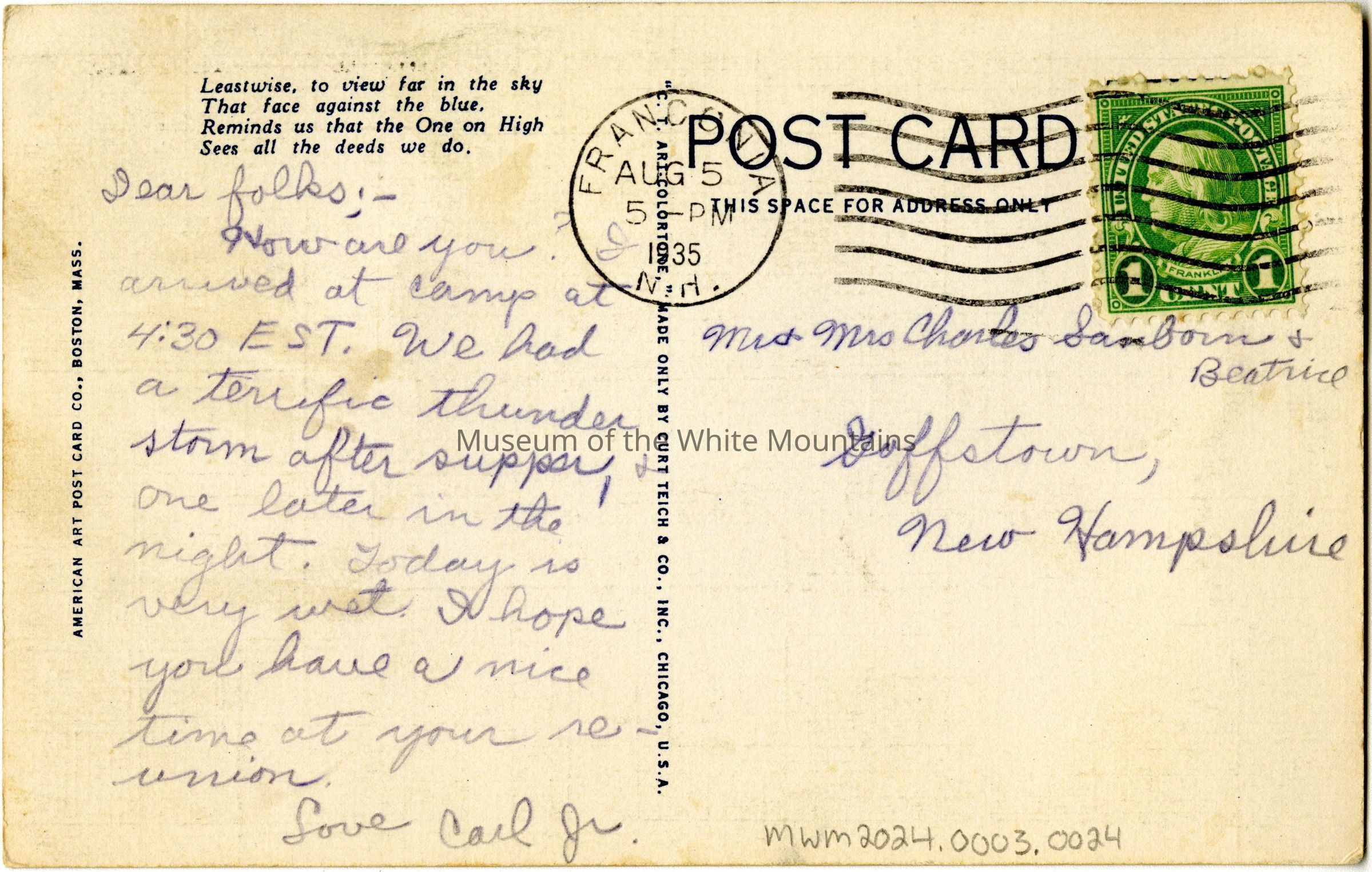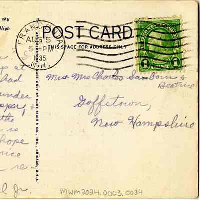 Postmarked from Franconia on August 5, 1935 at 5pm.