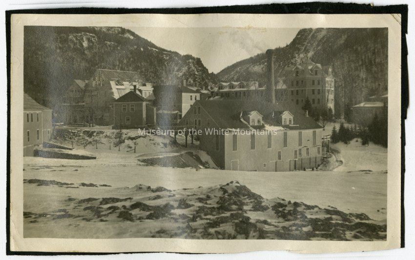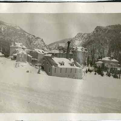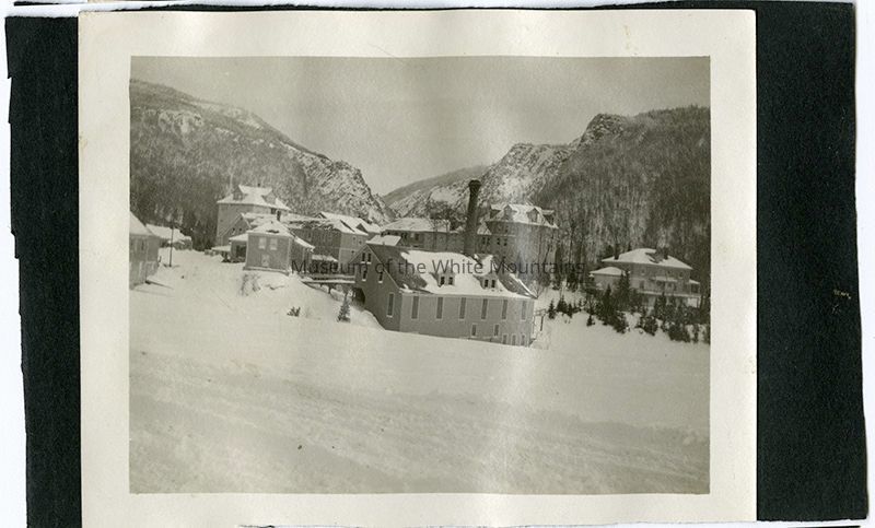 Cut from a photo album. Photograph of several buildings at the Balsams Hotel in the winter time. On the verso is the same view, but taken from further away.